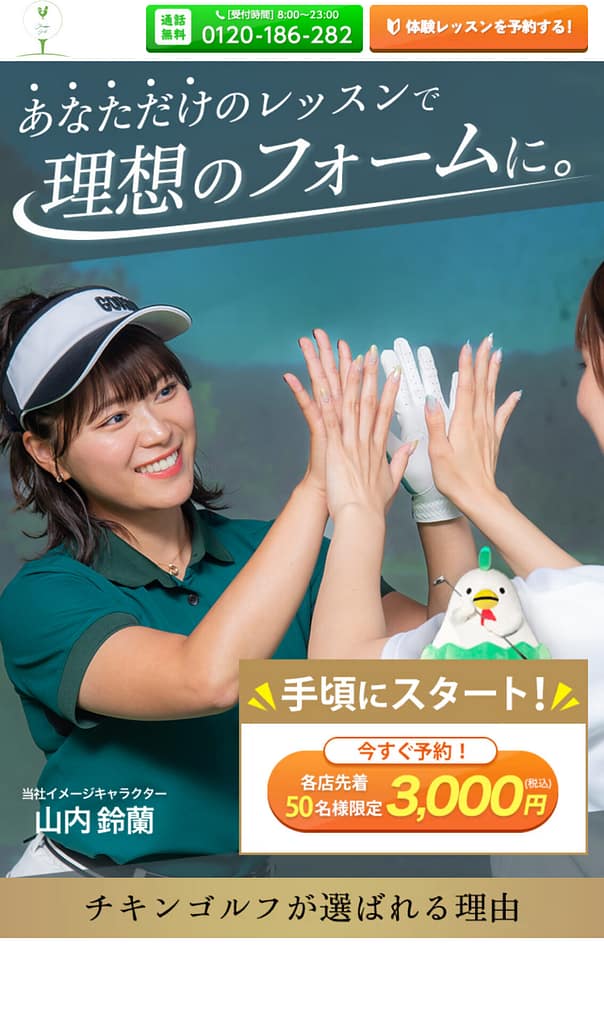 チキンゴルフ公式サイトのページ上部にある「体験レッスンを予約する」を押して、体験レッスン予約ページに移動します。