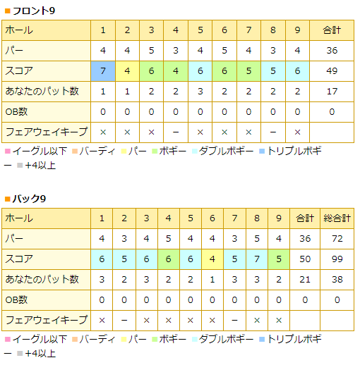 こんな感じでもパットは38に抑えることができて、スコアは99。ギリギリ100切りできちゃうのが分かるかと。