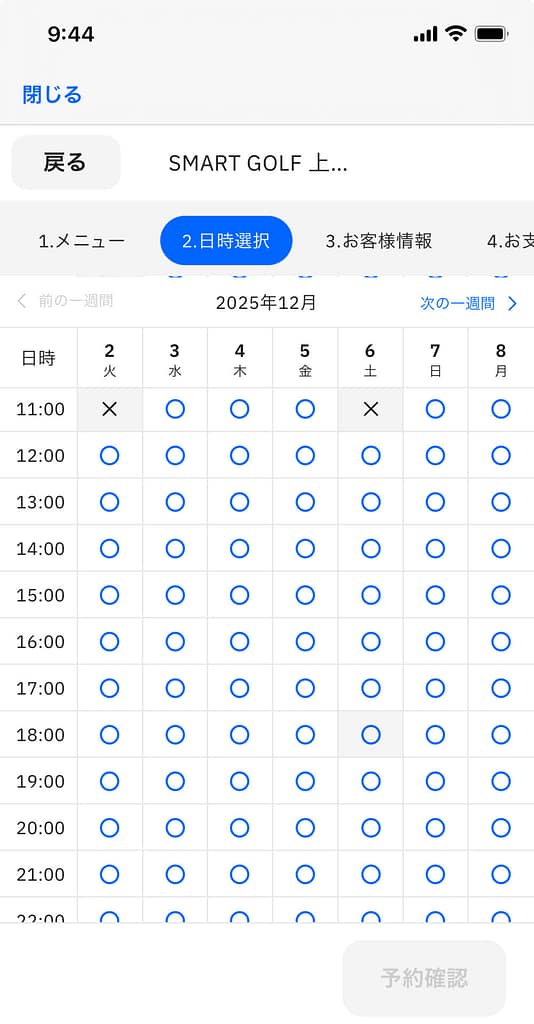 2025年12月2日(火)9時44分時点の上井草店の予約表です。