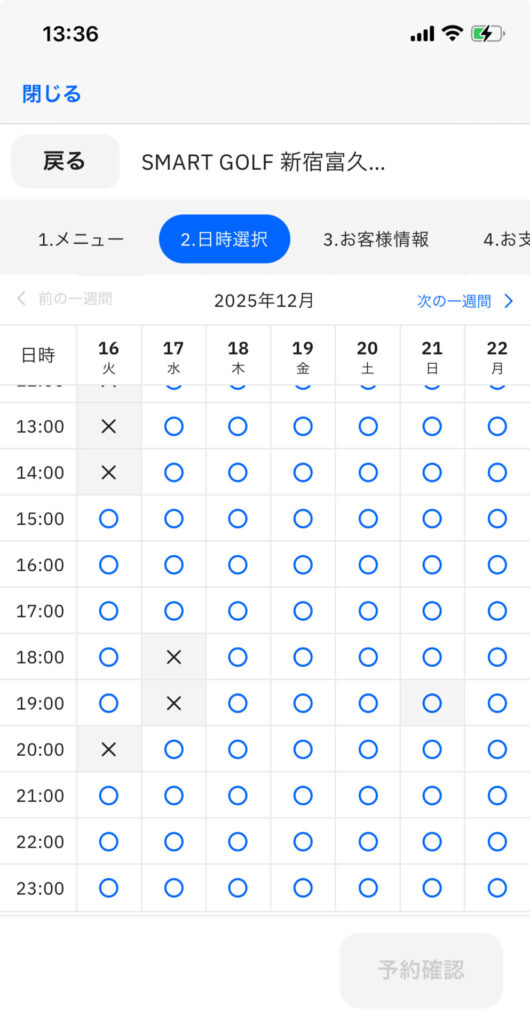 ということで、スマートゴルフ新宿富久町靖国通り店の打席予約表を確認してみました。